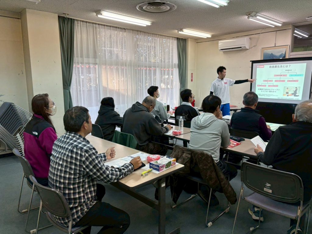 当日は、9時から17時までの丸1日にわたる講習で、座学、実技・訓練ともに充実した内容でした。参加者の大半は更新でしたが、3年前に受講したものの忘れている部分も多く、改めて一時救命処置の重要性や、繰り返し訓練を行う必要性を実感しました。また、有事を起こさないための予防が何より大切であると再認識できた、有意義な講習会でした。
